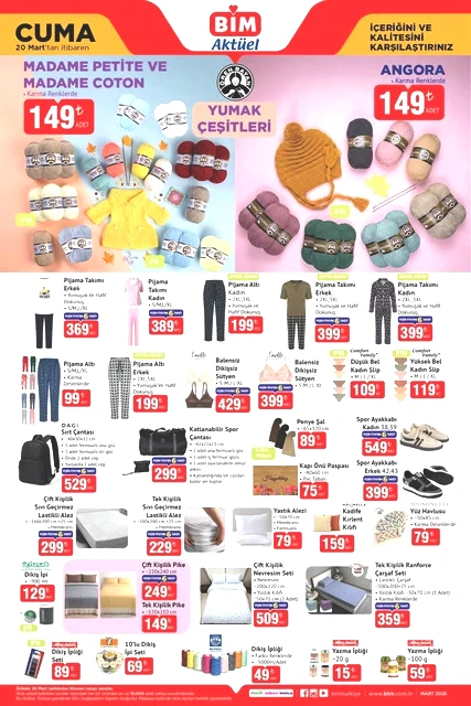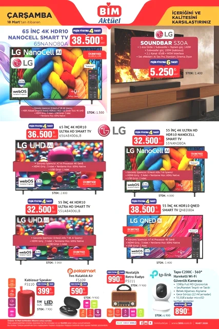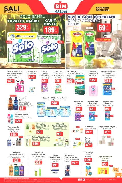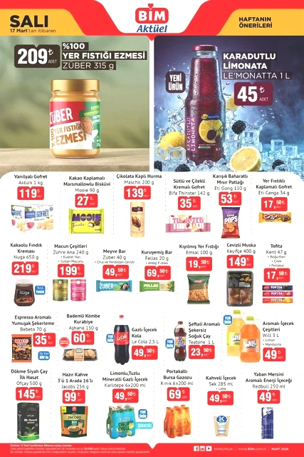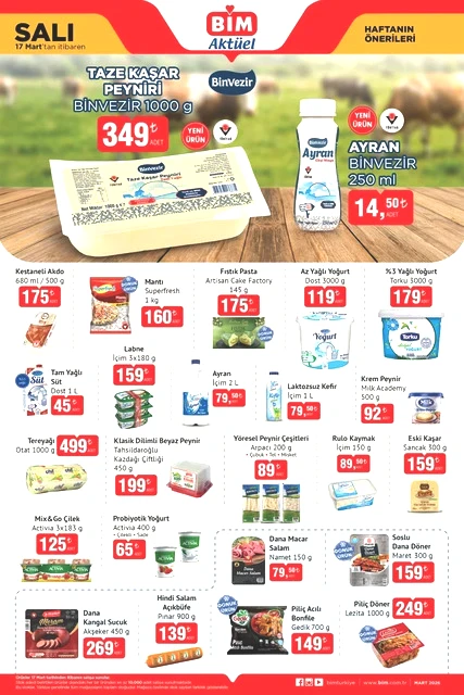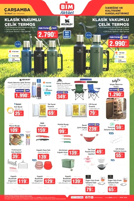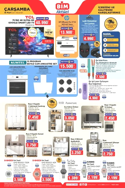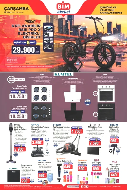 Mart ayının bu yeni haftasında, BİM marketlerinde satışa sunulacak olan yeni ürünler belli oldu. 17-18-20 Mart tarihlerine ait aktüel katalogda; televizyon, elektrikli bisiklet, yazıcı, ankastre fırın, davlumbaz, saç düzleştirici, lazer epilasyon cihazı, gardırop, şifonyer, halı ve koltuk yıkama makinesi, vücut bakım seti, toz torbasız elektrikli süpürge, çelik termos, kamp sandalyesi, sineklik, uzaktan kumandalı araç, ahşap araba rafı, TV ünitesi, katlanabilir spor çantası ve nevresim seti gibi birçok farklı ürün, alıcılarıyla buluşmaya hazırlanıyor. İşte BİM’in 17-18-20 Mart tarihli aktüel broşürü ile ilgili haberimiz...